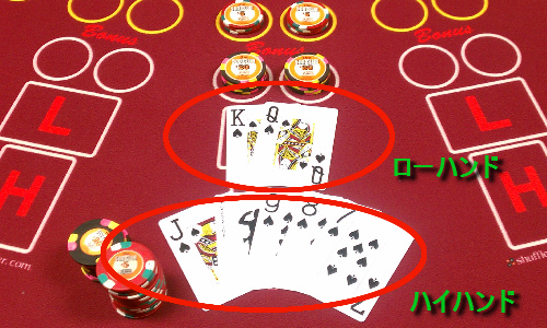 ハイハンドでは通常のポーカーの役を作ります。一方、ローハンドは2枚のカードで勝負します。例えば、2枚のカードで最も強い組み合わせはエースのペアとなります。2枚のカードがペアにならない場合には、カードの数の大小で数字の高い、低いで勝負します。